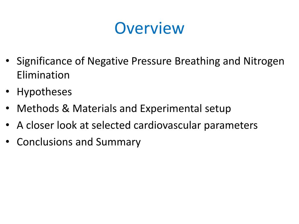 Overview • Significance of Negative Pressure Breathing and Nitrogen Elimination • Hypotheses • Methods & Materials and Experimental setup • A closer look at selected cardiovascular parameters • Conclusions and Summary