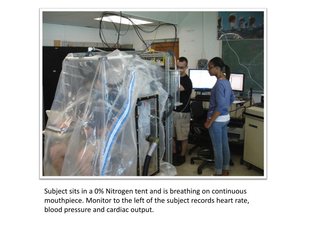 Subject sits in a 0% Nitrogen tent and is breathing on continuous mouthpiece. Monitor to the left of the subject records heart rate, blood pressure and cardiac output.