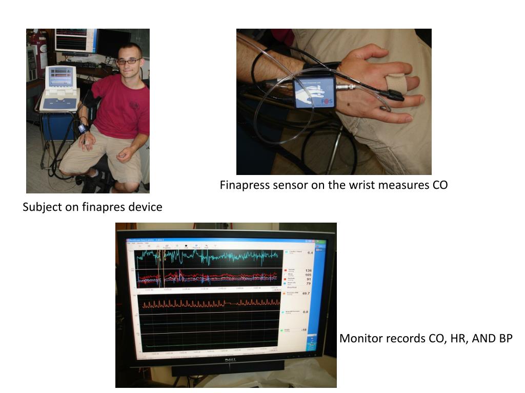 Finapress sensor on the wrist measures CO Subject on finapres device Monitor records CO, HR, AND BP