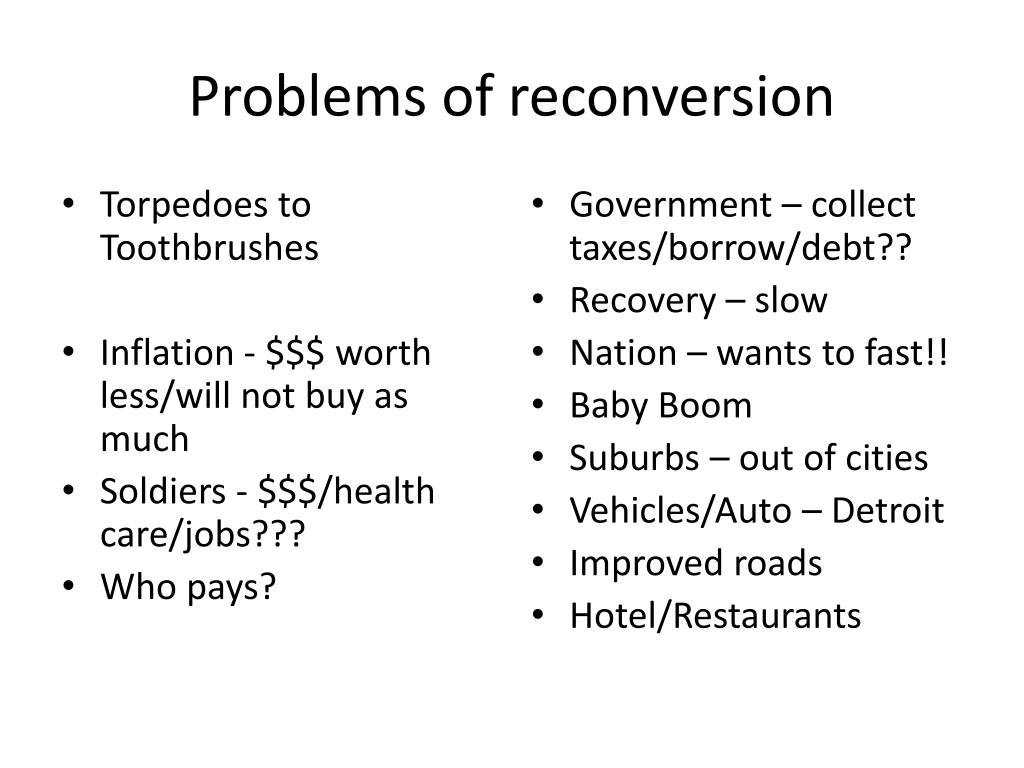 Problems of reconversion • Torpedoes to Toothbrushes • Inflation - $$$ worth less/will not buy as much • Soldiers - $$$/health care/jobs??? • Who pays? • Government – collect taxes/borrow/debt?? • Recovery – slow • Nation – wants to fast!! • Baby Boom • Suburbs – out of cities • Vehicles/Auto – Detroit • Improved roads • Hotel/Restaurants