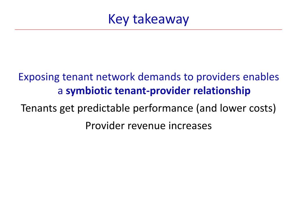 Key takeaway • Exposing tenant network demands to providers enables a symbiotic tenant-provider relationship • Tenants get predictable performance (and lower costs) • Provider revenue increases