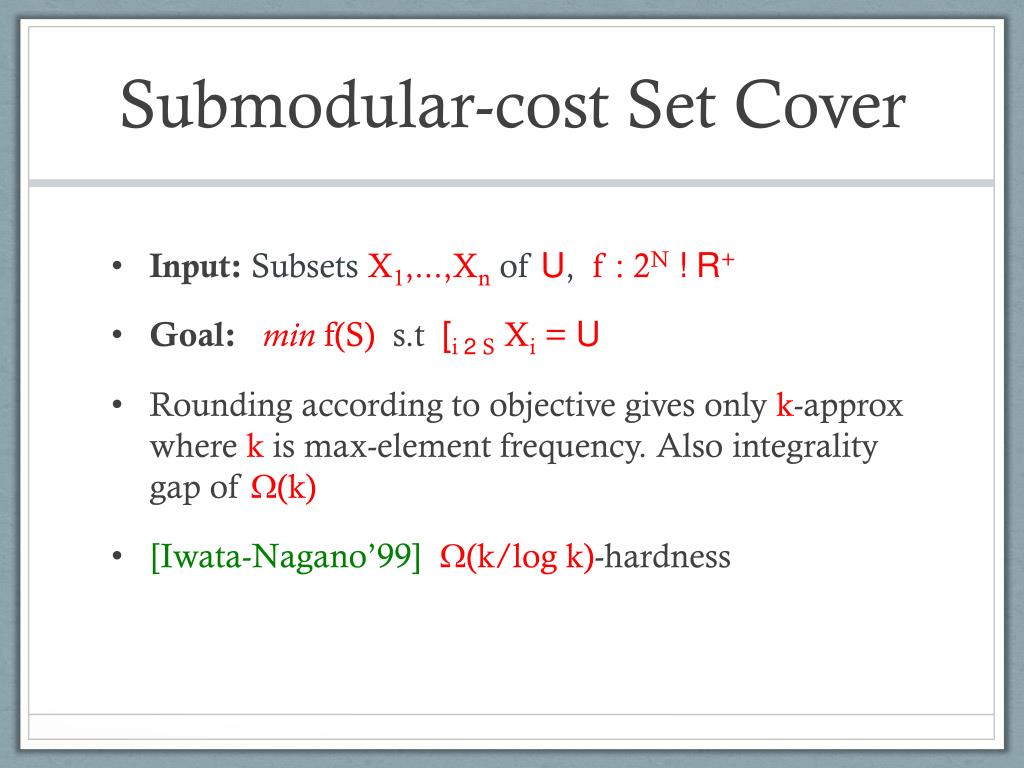 Submodular-cost Set Cover • Input:SubsetsX1,...,XnofU,f : 2N!R+ • Goal:min f(S) s.t[i2 SXi = U • Rounding according to objective gives only k-approx where k is max-element frequency. Also integrality gap of (k) • [Iwata-Nagano’99] (k/log k)-hardness