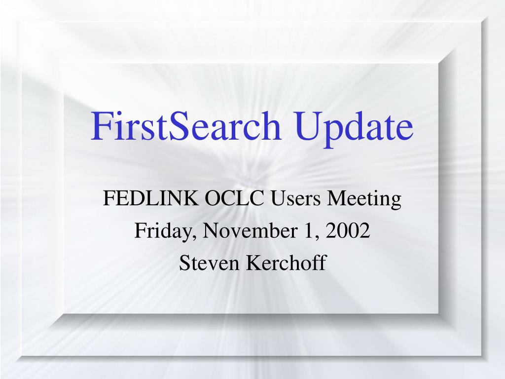 FirstSearch Update. FEDLINK OCLC Users Meeting Friday, November 1, 2002 Steven Kerchoff. FirstSearch Update. WorldCat Enhancements Linking to WorldCat “Get It” Options New Content Administrative Module Navigation Changes Customization Enhancements. FirstSearch Update.