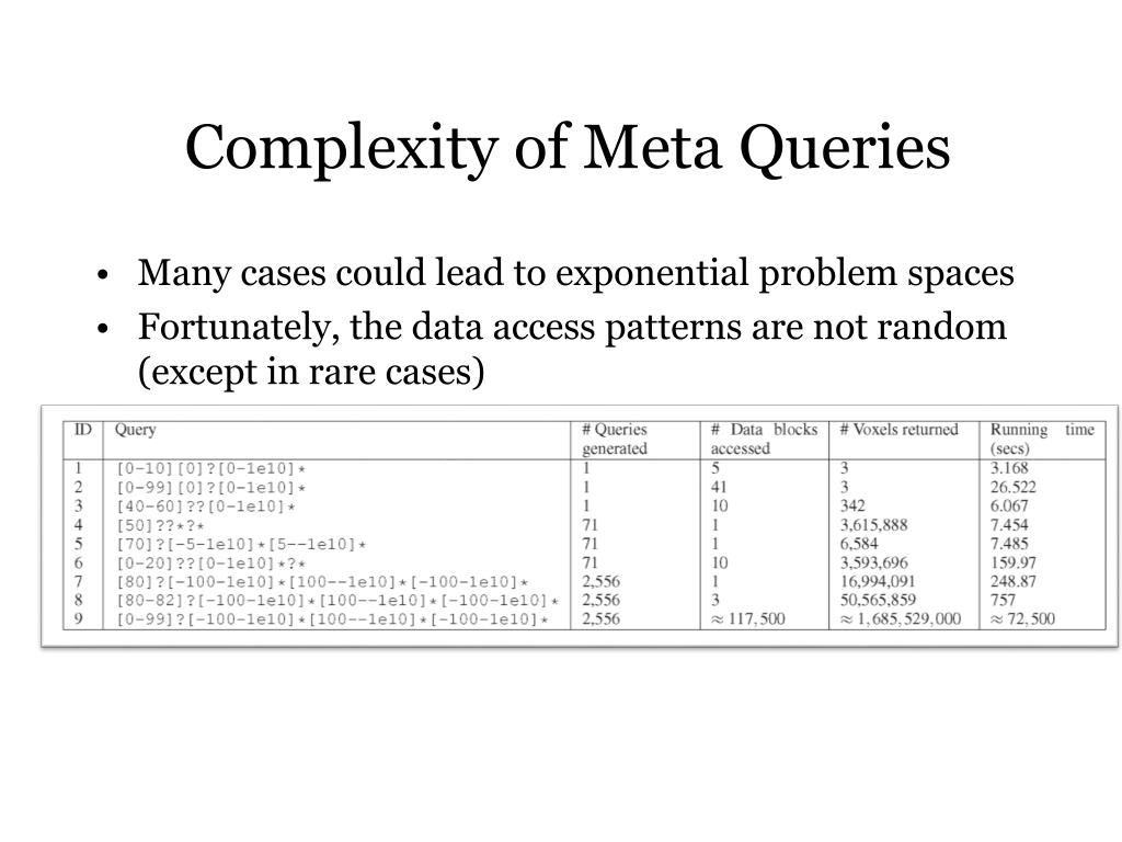 Complexity of Meta Queries • Many cases could lead to exponential problem spaces • Fortunately, the data access patterns are not random (except in rare cases)