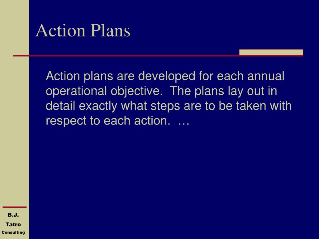 Action Plans Action plans are developed for each annual operational objective. The plans lay out in detail exactly what steps are to be taken with respect to each action. …