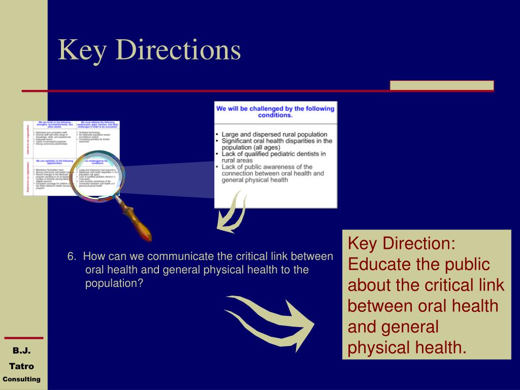 Key Directions Key Direction: Educate the public about the critical link between oral health and general physical health.