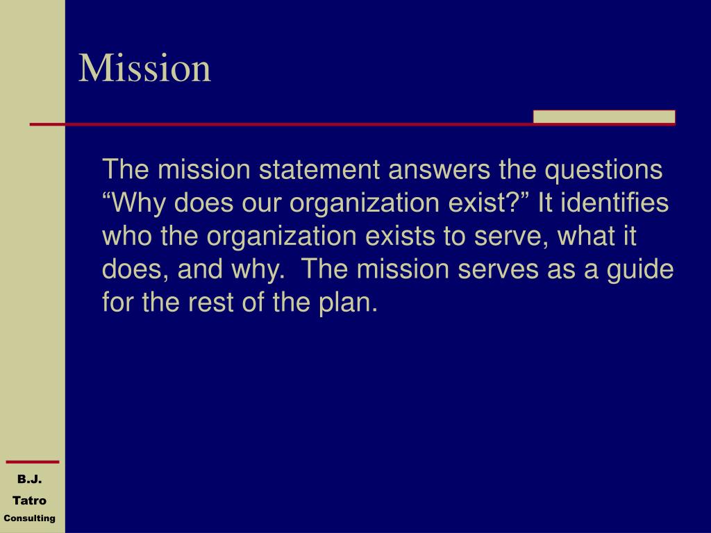 Mission The mission statement answers the questions “Why does our organization exist?” It identifies who the organization exists to serve, what it does, and why. The mission serves as a guide for the rest of the plan.