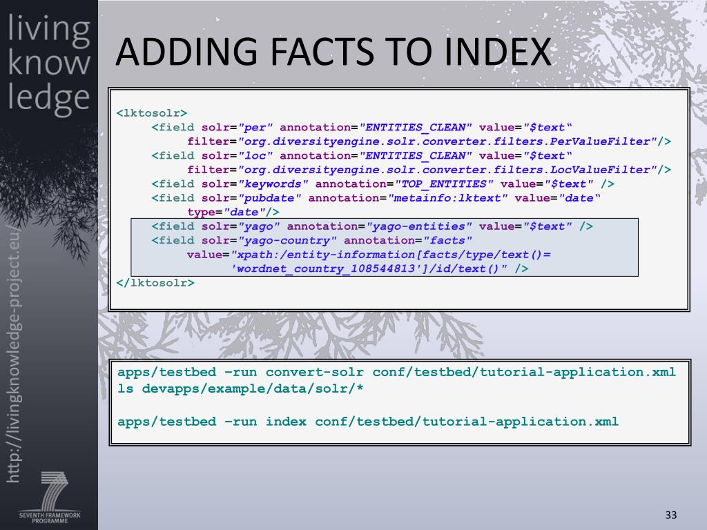 LK2SOLR CONVERSION <indexersolrHomeDir="solr/solr“ solrDataDir="solr/solr/data“ converter="conf/testbed/tutorial-lk2solr.xml"/> <lktosolr> <fieldsolr="per"annotation="ENTITIES_CLEAN"value="$text“ filter="org.diversityengine.solr.converter.filters.PerValueFilter"/> <fieldsolr="loc"annotation="ENTITIES_CLEAN"value="$text“ filter="org.diversityengine.solr.converter.filters.LocValueFilter"/> <fieldsolr="keywords"annotation="TOP_ENTITIES"value="$text" /> <fieldsolr="pubdate"annotation="metainfo:lktext"value="date“ type="date"/> </lktosolr> solr – Name of the field in solr annotation – Name of the LKXML Annotation value – Value of annotation filter – Allows post processing on annotation type – Only Date supported currently 32