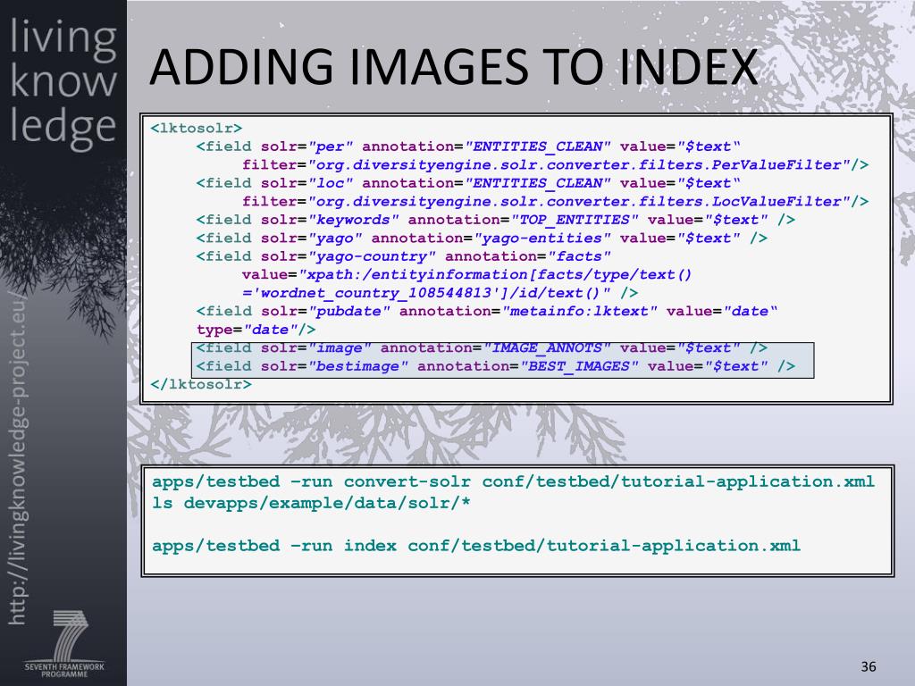 ADDING IMAGES TO INDEX <lktosolr> <fieldsolr="per"annotation="ENTITIES_CLEAN"value="$text“ filter="org.diversityengine.solr.converter.filters.PerValueFilter"/> <fieldsolr="loc"annotation="ENTITIES_CLEAN"value="$text“ filter="org.diversityengine.solr.converter.filters.LocValueFilter"/> <fieldsolr="keywords"annotation="TOP_ENTITIES"value="$text" /> <fieldsolr="yago"annotation="yago-entities"value="$text" /> <fieldsolr="yago-country"annotation="facts" value="xpath:/entityinformation[facts/type/text() ='wordnet_country_108544813']/id/text()" /> <fieldsolr="pubdate"annotation="metainfo:lktext"value="date“ type="date"/> <fieldsolr="image"annotation="IMAGE_ANNOTS"value="$text" /> <fieldsolr="bestimage"annotation="BEST_IMAGES"value="$text" /> </lktosolr> apps/testbed –run convert-solr conf/testbed/tutorial-application.xml ls devapps/example/data/solr/* apps/testbed –run index conf/testbed/tutorial-application.xml 36