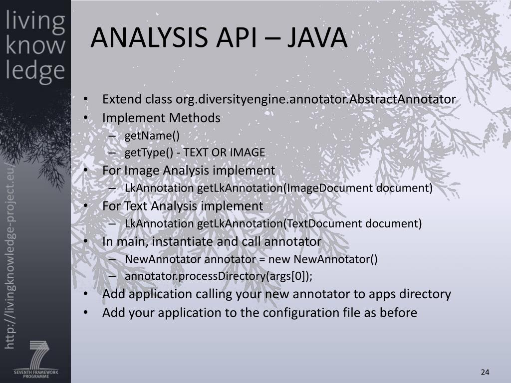 ANALYSIS API Documents in LK XML format Annotators passed a single document directory –They should add annotations for each document in directory Files will have consistent naming convention LkText file = id + “.lktext.xml” LkMedia = id + “.lkmedia.xml” LkAnnotation = id + “.” + annotatorId + “.xml” Annotators will be processed sequentially in the order listed in the XML file Annotators can be written in any language but must run on Linux – Helper classes will exist for Java, but there is no obligation to use them. Add application calling your new annotator to apps directory Add your application to the configuration file as before 23