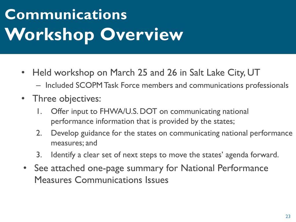 Held workshop on March 25 and 26 in Salt Lake City, UT Included SCOPM Task Force members and communications professionals Three objectives: Offer input to FHWA/U.S. DOT on communicating national performance information that is provided by the states; Develop guidance for the states on communicating national performance measures; and Identify a clear set of next steps to move the states’ agenda forward. See attached one-page summary for National Performance Measures Communications Issues CommunicationsWorkshop Overview
