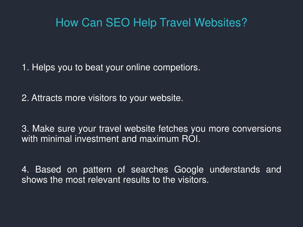 How Can SEO Help Travel Websites? 1. Helps you to beat your online competiors. 2. Attracts more visitors to your website. 3. Make sure your travel website fetches you more conversions with minimal investment and maximum ROI. 4. Based on pattern of searches Google understands and shows the most relevant results to the visitors.