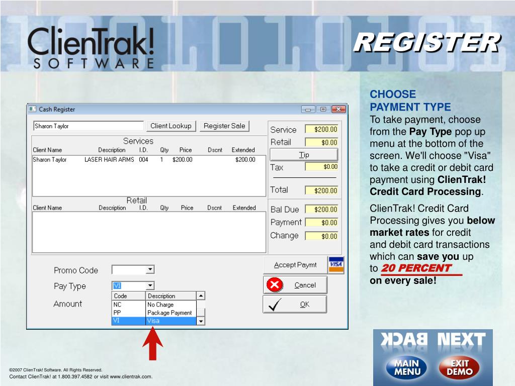 REGISTER CHOOSE PAYMENT TYPE To take payment, choose from the Pay Type pop up menu at the bottom of the screen. We'll choose "Visa" to take a credit or debit card payment using ClienTrak!Credit Card Processing. ClienTrak! Credit Card Processing gives you below market rates for credit and debit card transactions which can save you up to 20 PERCENT on every sale! ©2007 ClienTrak! Software. All Rights Reserved. Contact ClienTrak! at 1.800.397.4582 or visit www.clientrak.com.