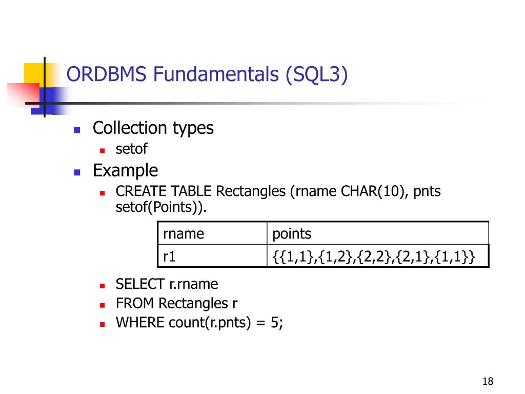 ORDBMS Fundamentals (SQL3) • Collection types • setof • Example • CREATE TABLE Rectangles (rname CHAR(10), pnts setof(Points)). • SELECT r.rname • FROM Rectangles r • WHERE count(r.pnts) = 5;