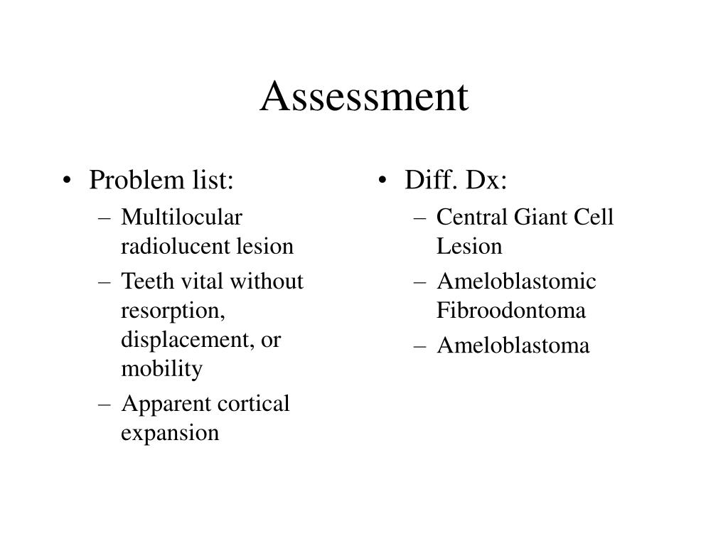 Problem list: Multilocular radiolucent lesion Teeth vital without resorption, displacement, or mobility Apparent cortical expansion Diff. Dx: Central Giant Cell Lesion Ameloblastomic Fibroodontoma Ameloblastoma Assessment