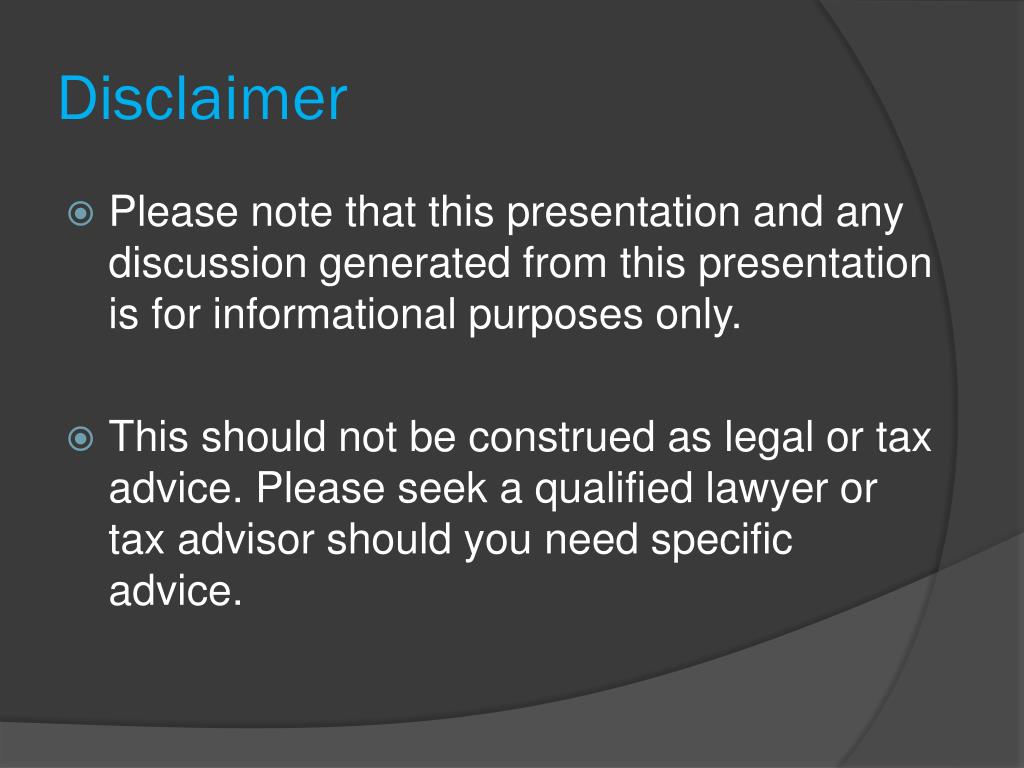 Disclaimer • Please note that this presentation and any discussion generated from this presentation is for informational purposes only. • This should not be construed as legal or tax advice. Please seek a qualified lawyer or tax advisor should you need specific advice.