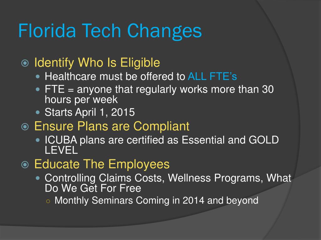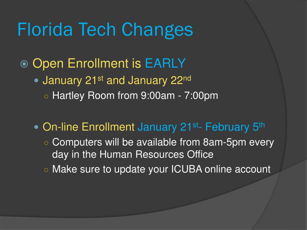 Florida Tech Changes • Open Enrollment is EARLY • January 21st and January 22nd • Hartley Room from 9:00am - 7:00pm • On-line Enrollment January 21st- February 5th • Computers will be available from 8am-5pm every day in the Human Resources Office • Make sure to update your ICUBA online account