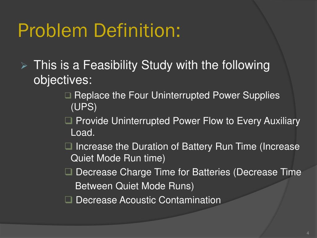 Problem Definition: • This is a Feasibility Study with the following objectives: • Replace the Four Uninterrupted Power Supplies (UPS) • Provide Uninterrupted Power Flow to Every Auxiliary Load. • Increase the Duration of Battery Run Time (Increase Quiet Mode Run time) • Decrease Charge Time for Batteries (Decrease Time Between Quiet Mode Runs) • Decrease Acoustic Contamination
