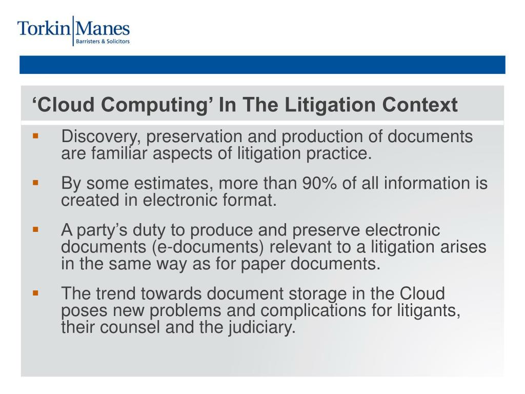 The Sedona Conference Guidelines and Practical Precedents for E-Discovery. Litigating in the Cloud. Tanisha G. Tulloch. 416 777 5359. ttulloch@totkinmanes.com. LEXPERT Cloud Computing Conference 2013. November 28, 2013, Toronto. ‘Cloud Computing’ In The Litigation Context.