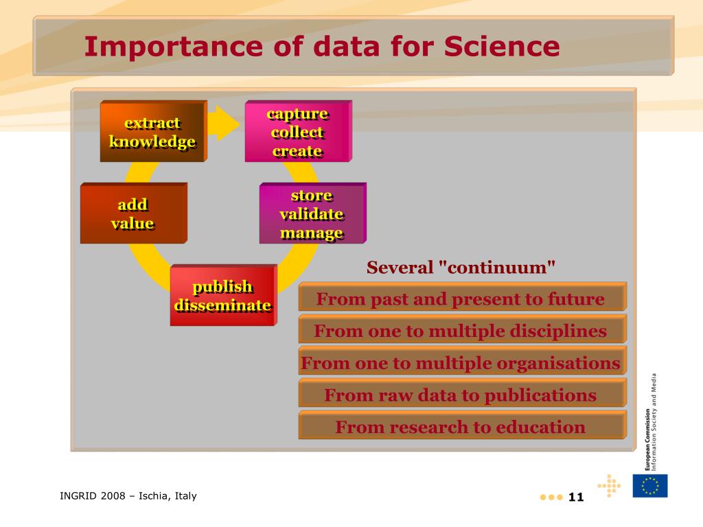 capture collect create extract knowledge store validate manage add value Several "continuum" publish disseminate From past and present to future From one to multiple disciplines From one to multiple organisations From raw data to publications From research to education Importance of data for Science INGRID 2008 – Ischia, Italy