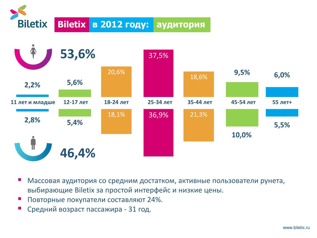 Biletix в 2012 году: аудитория 53,6% 37,5% 20,6% 9,5% 6,0% 18,6% 5,6% 2,2% 11 лет и младше 12-17 лет 18-24 лет 25-34 лет 35-44 лет 45-54 лет 55 лет+ 18,1% 36,9% 21,3% 2,8% 5,4% 5,5% 10,0% 46,4% • Массовая аудитория со средним достатком, активные пользователи рунета, выбирающие Biletix за простой интерфейс и низкие цены. • Повторные покупатели составляют 24%. • Средний возраст пассажира - 31 год. www.biletix.ru