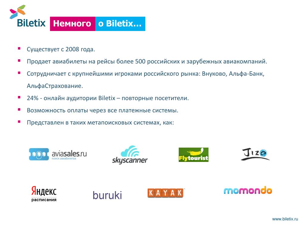 Немного о Biletix… • Существует с 2008 года. • Продает авиабилеты на рейсы более 500 российских и зарубежных авиакомпаний. • Сотрудничает с крупнейшими игроками российского рынка: Внуково, Альфа-Банк, АльфаСтрахование. • 24% - онлайн аудитории Biletix – повторные посетители. • Возможность оплаты через все платежные системы. • Представлен в таких метапоисковых системах, как: www.biletix.ru