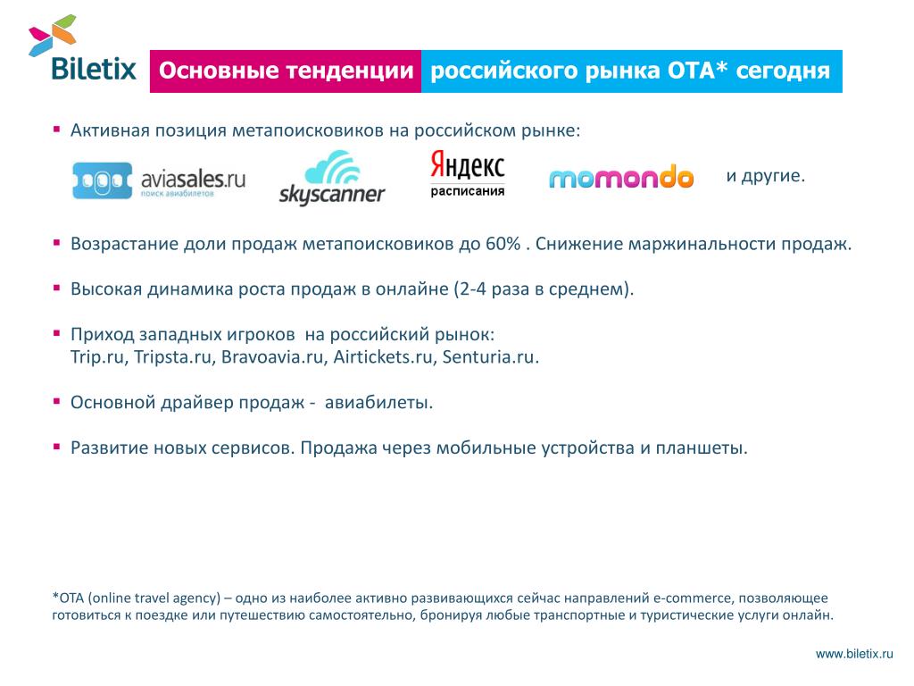 Основные тенденции российского рынка ОТА* сегодня • Активная позиция метапоисковиков на российском рынке: и другие. • Возрастание доли продаж метапоисковиков до 60% . Снижение маржинальностипродаж. • Высокая динамика роста продаж в онлайне (2-4 раза в среднем). • Приход западных игроков на российский рынок: Trip.ru, Tripsta.ru, Bravoavia.ru, Airtickets.ru, Senturia.ru. • Основной драйвер продаж - авиабилеты. • Развитие новых сервисов. Продажа через мобильные устройстваи планшеты. *OTA (online travel agency) – одно из наиболее активно развивающихся сейчас направлений e-commerce, позволяющее готовиться к поездке или путешествию самостоятельно, бронируя любые транспортные и туристические услуги онлайн. www.biletix.ru