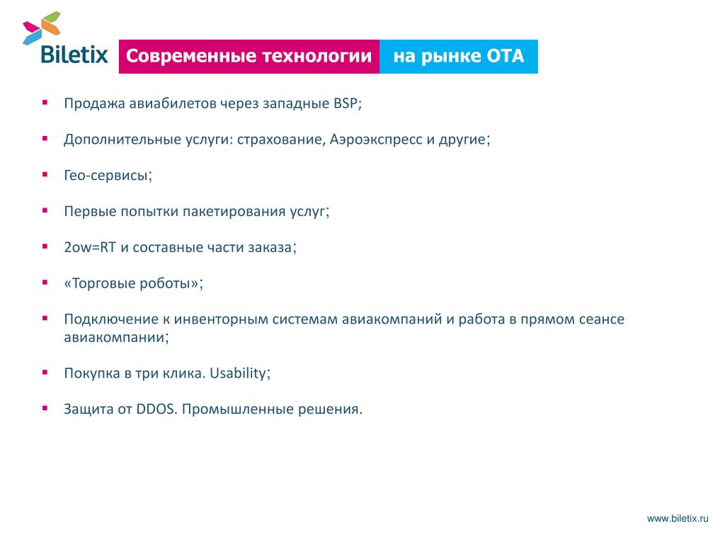Современные технологии на рынке OTA • Продажа авиабилетов через западные BSP; • Дополнительные услуги: страхование, Аэроэкспресс и другие; • Гео-сервисы; • Первые попытки пакетирования услуг; • 2ow=RT и составные части заказа; • «Торговые роботы»; • Подключение к инвенторным системам авиакомпаний и работа в прямом сеансе авиакомпании; • Покупка в три клика. Usability; • Защита от DDOS. Промышленные решения. www.biletix.ru