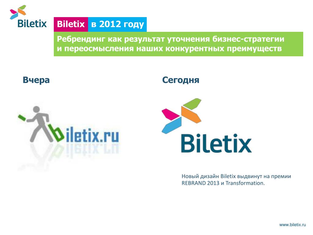 Biletix в 2012 году Ребрендинг как результат уточнения бизнес-стратегии и переосмысления наших конкурентных преимуществ Вчера Сегодня Новый дизайн Biletix выдвинут на премии REBRAND 2013и Transformation. www.biletix.ru