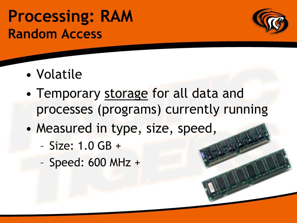 Processing: RAMRandom Access • Volatile • Temporary storage for all data and processes (programs) currently running • Measured in type, size, speed, • Size: 1.0 GB + • Speed: 600 MHz +