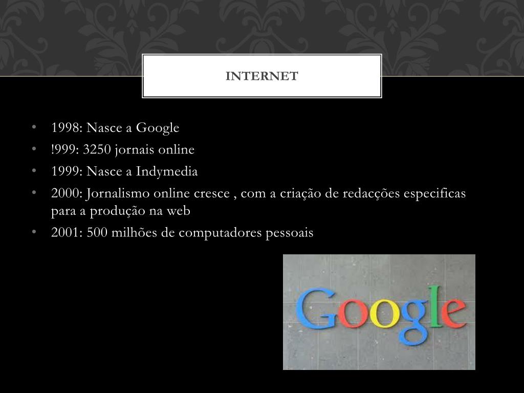 Internet • 1998: Nasce a Google • !999: 3250 jornais online • 1999: Nasce a Indymedia • 2000: Jornalismo online cresce , com a criação de redacções especificas para a produção na web • 2001: 500 milhões de computadores pessoais