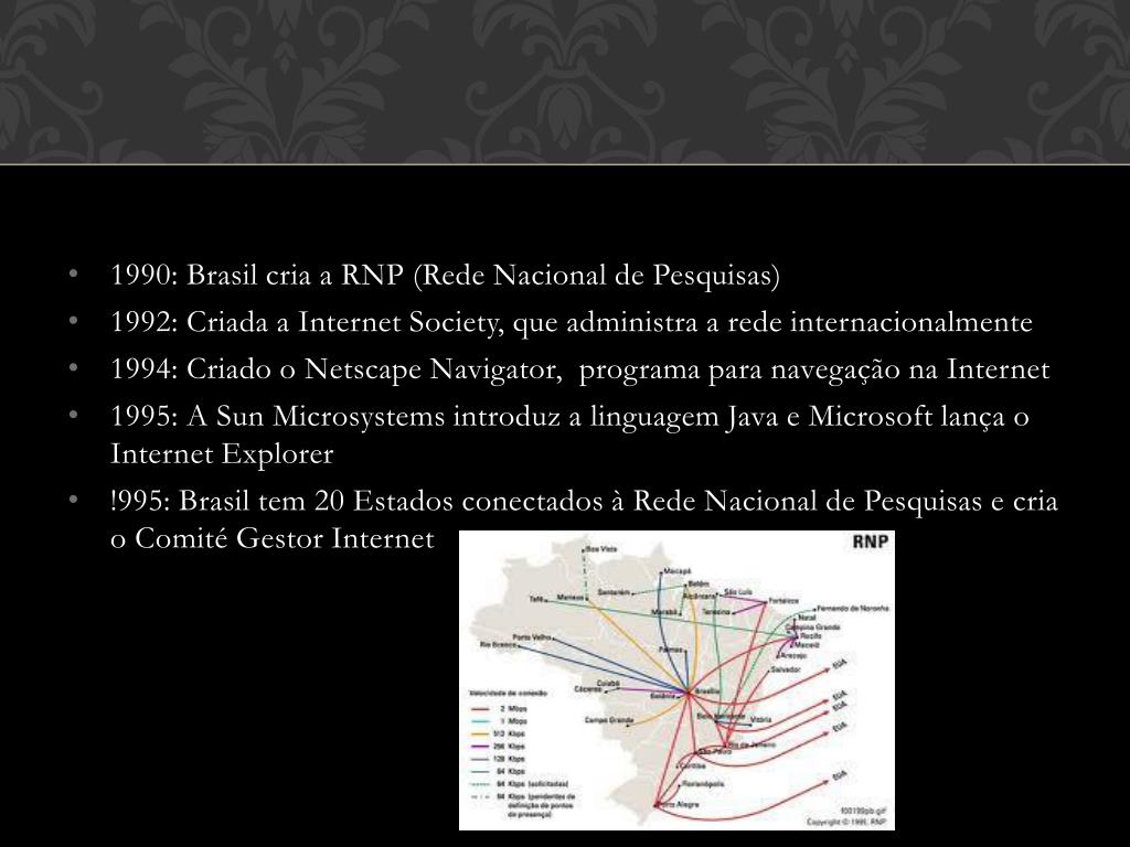 1990: Brasil cria a RNP (Rede Nacional de Pesquisas) • 1992: Criada a Internet Society, que administra a rede internacionalmente • 1994: Criado o Netscape Navigator, programa para navegação na Internet • 1995: A Sun Microsystems introduz a linguagem Java e Microsoft lança o Internet Explorer • !995: Brasil tem 20 Estados conectados à Rede Nacional de Pesquisas e cria o Comité Gestor Internet