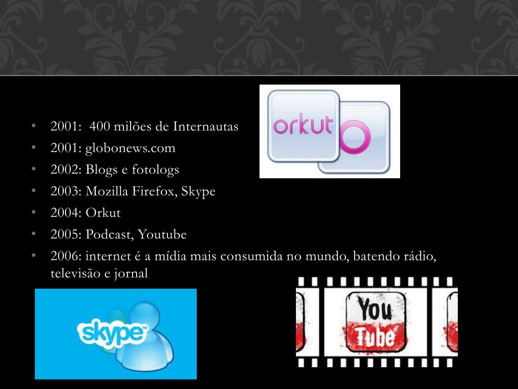 2001: 400 milões de Internautas • 2001: globonews.com • 2002: Blogs e fotologs • 2003: Mozilla Firefox, Skype • 2004: Orkut • 2005: Podcast, Youtube • 2006: internet é a mídia mais consumida no mundo, batendo rádio, televisão e jornal