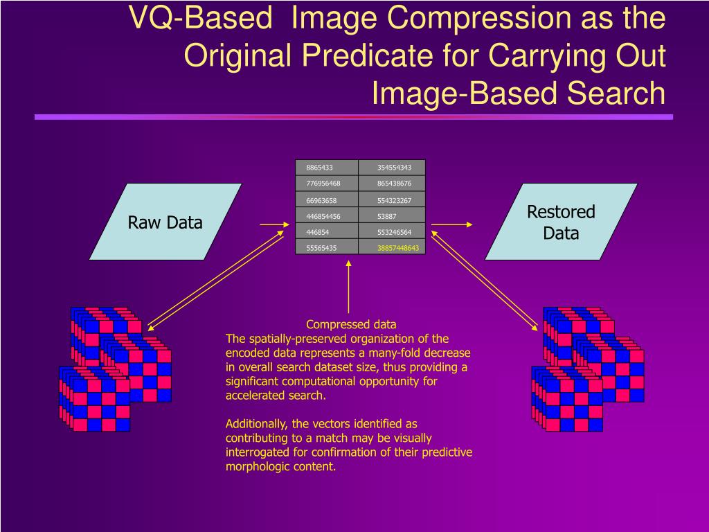 VQ-Based Image Compression as the Original Predicate for Carrying OutImage-Based Search 8865433 354554343 776956468 865438676 66963658 554323267 446854456 53887 446854 553246564 55565435 38857448643 Raw Data Restored Data Compressed data The spatially-preserved organization of the encoded data represents a many-fold decrease in overall search dataset size, thus providing a significant computational opportunity for accelerated search. Additionally, the vectors identified as contributing to a match may be visually interrogated for confirmation of their predictive morphologic content.
