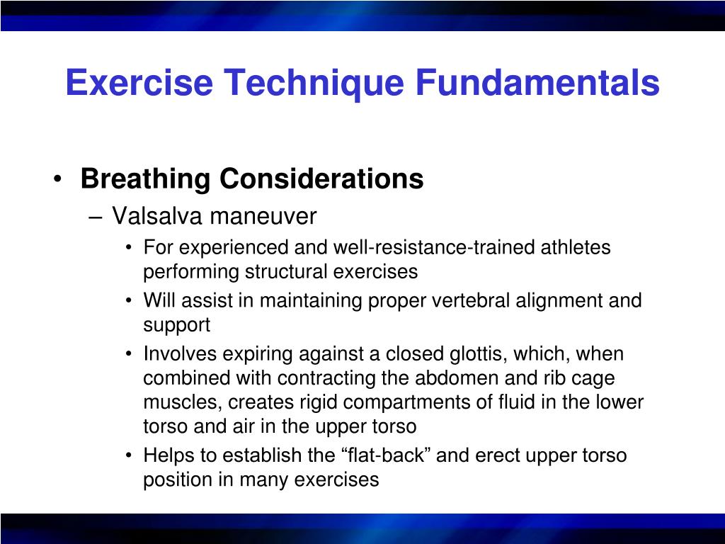 Exercise Technique Fundamentals • Breathing Considerations • Valsalva maneuver • For experienced and well-resistance-trained athletes performing structural exercises • Will assist in maintaining proper vertebral alignment and support • Involves expiring against a closed glottis, which, when combined with contracting the abdomen and rib cage muscles, creates rigid compartments of fluid in the lower torso and air in the upper torso • Helps to establish the “flat-back” and erect upper torso position in many exercises