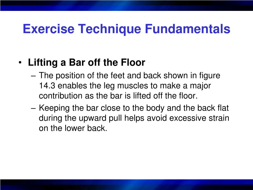 Exercise Technique Fundamentals • Lifting a Bar off the Floor • The position of the feet and back shown in figure 14.3 enables the leg muscles to make a major contribution as the bar is lifted off the floor. • Keeping the bar close to the body and the back flat during the upward pull helps avoid excessive strain on the lower back.