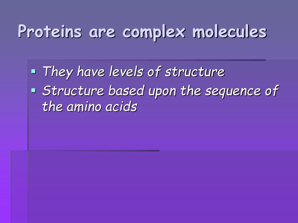 Proteins are complex molecules • They have levels of structure • Structure based upon the sequence of the amino acids
