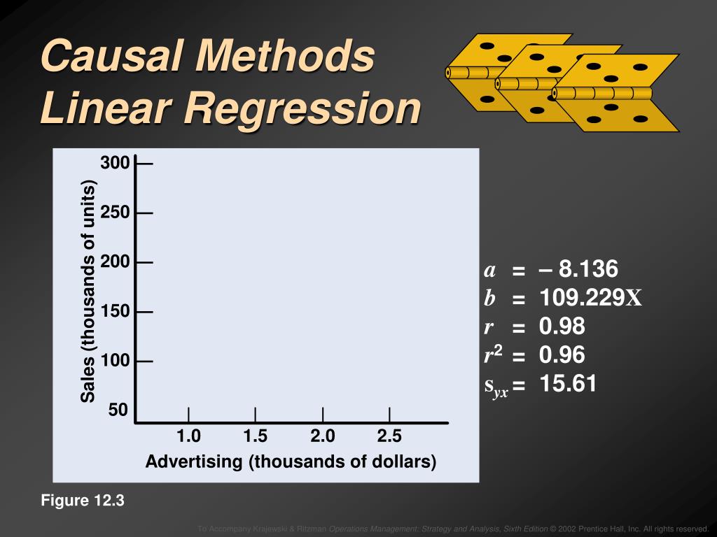 300 — 250 — 200 — 150 — 100 — 50 Sales Advertising Month (000 units) (000 $) 1 264 2.5 2 116 1.3 3 165 1.4 4 101 1.0 5 209 2.0 a = – 8.136 b = 109.229X r = 0.98 r2 = 0.96 syx = 15.61 Sales (thousands of units) | | | | 1.0 1.5 2.0 2.5 Advertising (thousands of dollars) Causal MethodsLinear Regression Figure 12.3