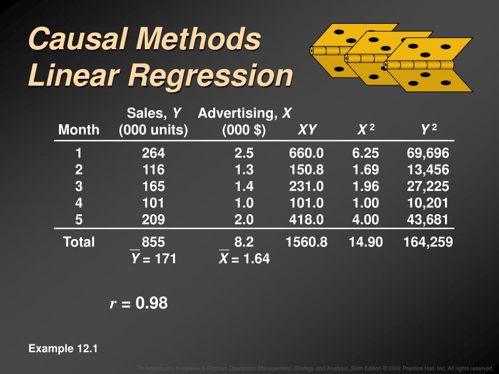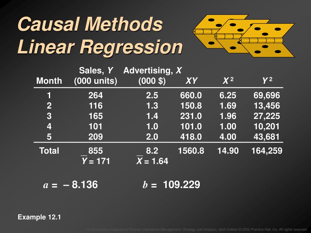 Sales, Y Advertising, X Month (000 units) (000 $) XYX 2Y 2 1 264 2.5 660.0 6.25 69,696 2 116 1.3 150.8 1.69 13,456 3 165 1.4 231.0 1.96 27,225 4 101 1.0 101.0 1.00 10,201 5 209 2.0 418.0 4.00 43,681 XY – nXY X 2 – nX 2 a = Y – bX b = Causal MethodsLinear Regression Example 12.1