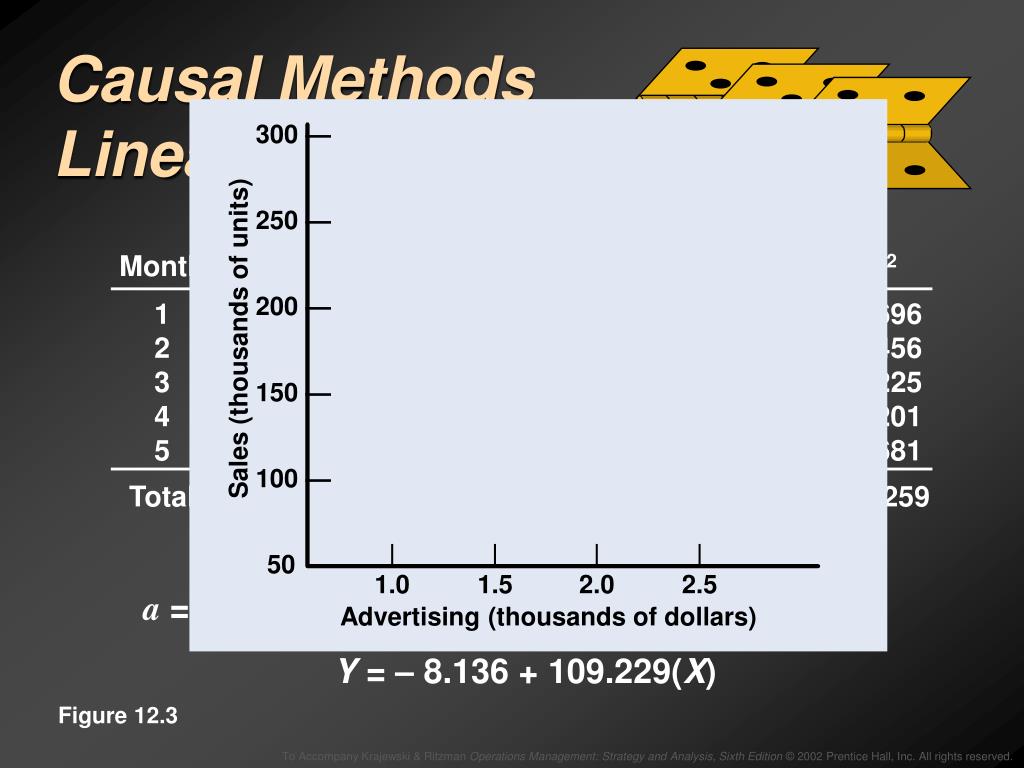 Sales Advertising Month (000 units) (000 $) 1 264 2.5 2 116 1.3 3 165 1.4 4 101 1.0 5 209 2.0 Causal MethodsLinear Regression Example 12.1