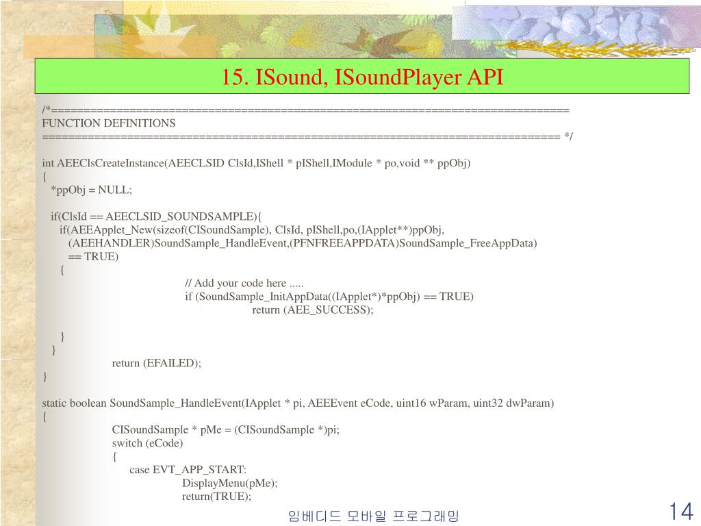 15. ISound, ISoundPlayer API • case MENU_EVT_SOUNDPLAYER2: • { • AEESoundPlayerInfo info; • IDISPLAY_ClearScreen (pMe->a.m_pIDisplay); • IMENUCTL_SetProperties(pMe->m_pIMenu, MP_NO_REDRAW); • IMENUCTL_SetActive(pMe->m_pIMenu, FALSE); • DisplayOutput((IApplet *)pMe, 1, "Answer the phone 듣기", MAKE_RGB(0,0,0)); • if(ISHELL_CreateInstance(pMe->a.m_pIShell, AEECLSID_SOUNDPLAYER, (void **)&pMe->m_pISoundPlayer)) • return TRUE; • ISOUNDPLAYER_RegisterNotify(pMe->m_pISoundPlayer, &SoundPlayerCBFn, (void *)pMe); • //ISOUNDPLAYER_Set(pMe->m_pISoundPlayer, SDT_FILE, “audio2.qcp"); • info.eInput = SDT_FILE; • info.pData = (void *)"sample.qcp"; • info.dwSize = 0; • ISOUNDPLAYER_SetInfo(pMe->m_pISoundPlayer, &info); • ISOUNDPLAYER_Play (pMe->m_pISoundPlayer); • return TRUE; • } • default: • return TRUE; • } • } • default: • break; • } • return FALSE; • } 임베디드 모바일 프로그래밍