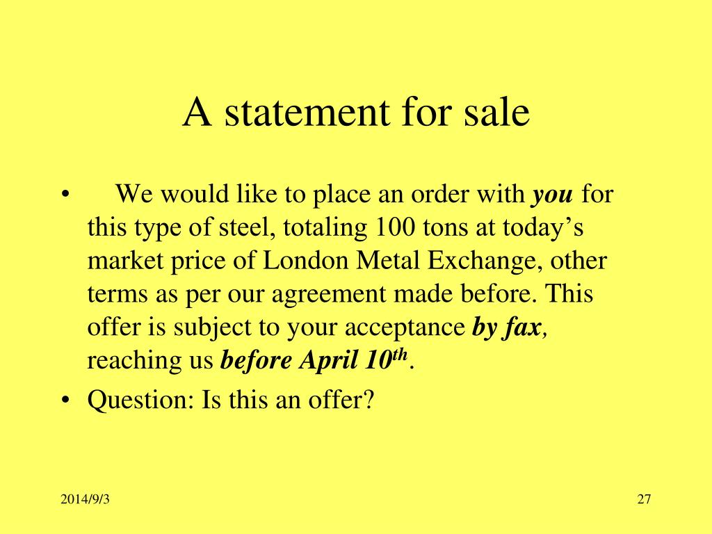 Reconsideration of the example of a statement for sale • “ we would like to place an order with you for this type of steel, totaling 1000 tons at today’s price of London Metal Exchange , other terms as per our agreement made before. This order is open for your acceptance by fax, reaching us before May 10th our time.” • Question: is this an offer ? Why?