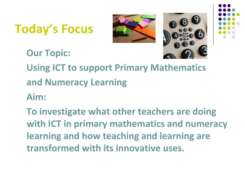 Today’s Focus Our Topic: Using ICT to support Primary Mathematics and Numeracy Learning Aim: To investigate what other teachers are doing with ICT in primary mathematics and numeracy learning and how teaching and learning are transformed with its innovative uses.