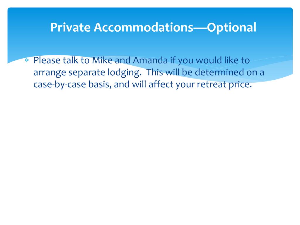 Private Accommodations—Optional • Please talk to Mike and Amanda if you would like to arrange separate lodging. This will be determined on a case-by-case basis, and will affect your retreat price.