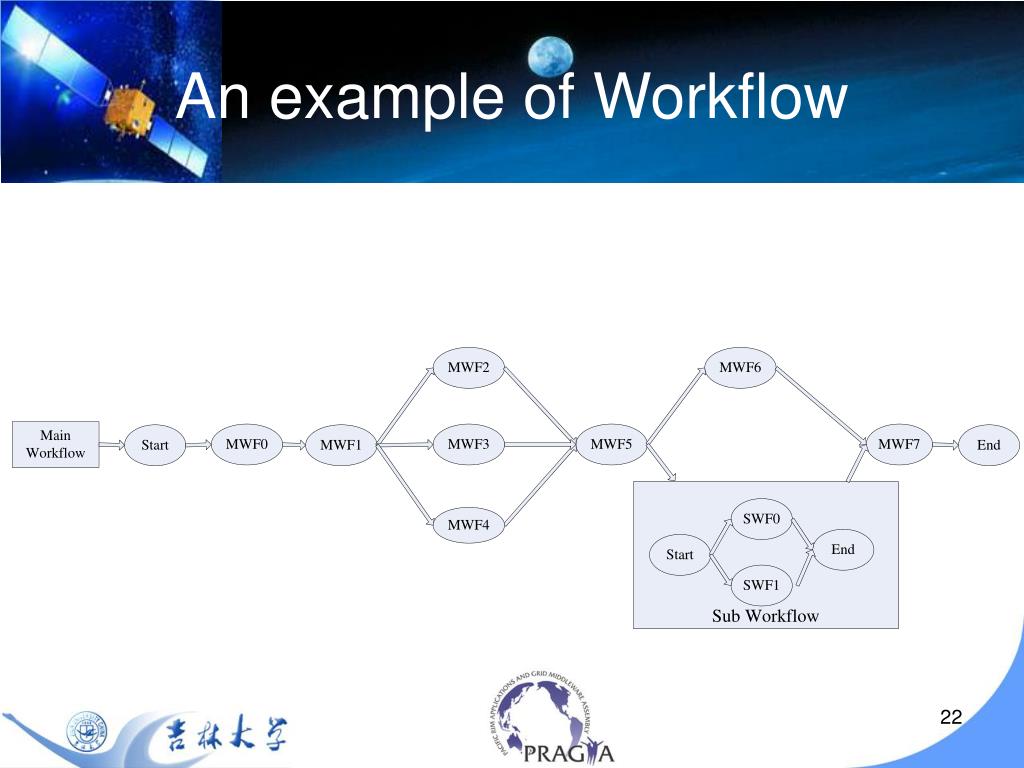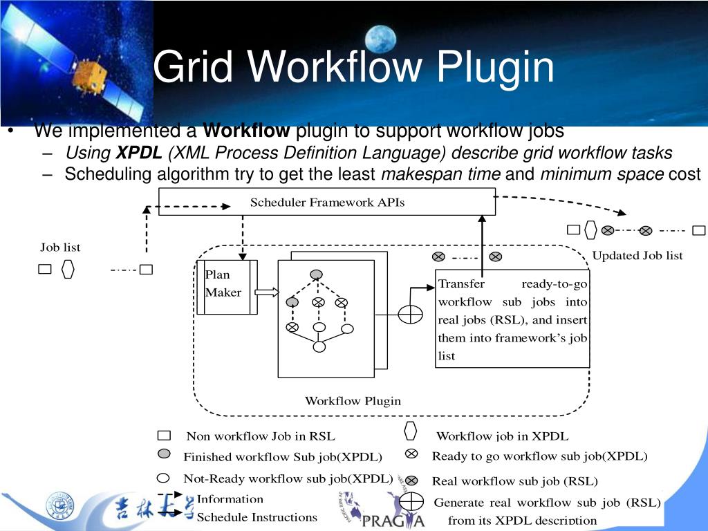 Grid Workflow Plugin • We implemented a Workflow plugin to support workflow jobs • Using XPDL (XML Process Definition Language) describe grid workflow tasks • Scheduling algorithm try to get the least makespan time and minimum space cost