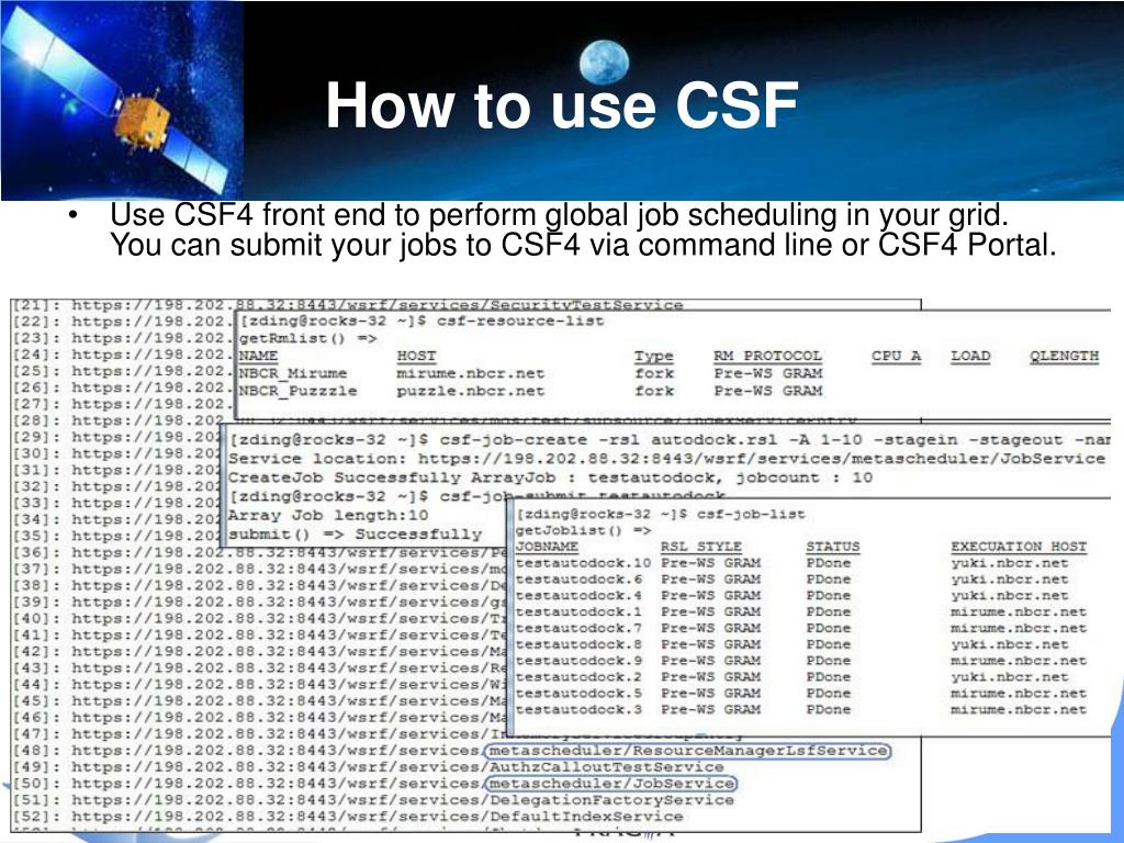 How to use CSF • Use CSF4 front end to perform global job scheduling in your grid. You can submit your jobs to CSF4 via command line or CSF4 Portal.