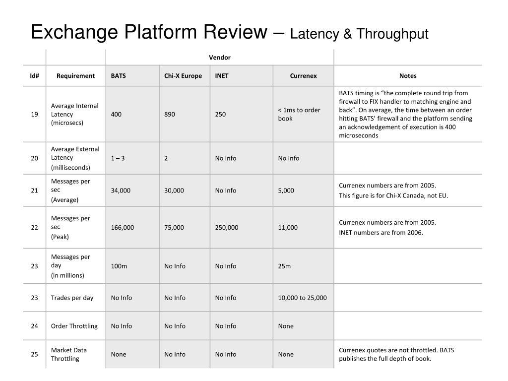 Review of BATS, Chi-X, and Currenex platforms, including services, performance, and technology. Explore ownership, latency, connectivity, and data center aspects. Limitations of internet-based research discussed.
