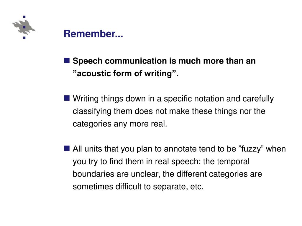 Remember... • Speech communication is much more than an ”acoustic form of writing”. • Writing things down in a specific notation and carefully classifying them does not make these things nor the categories any more real. • All units that you plan to annotate tend to be ”fuzzy” when you try to find them in real speech: the temporal boundaries are unclear, the different categories are sometimes difficult to separate, etc.