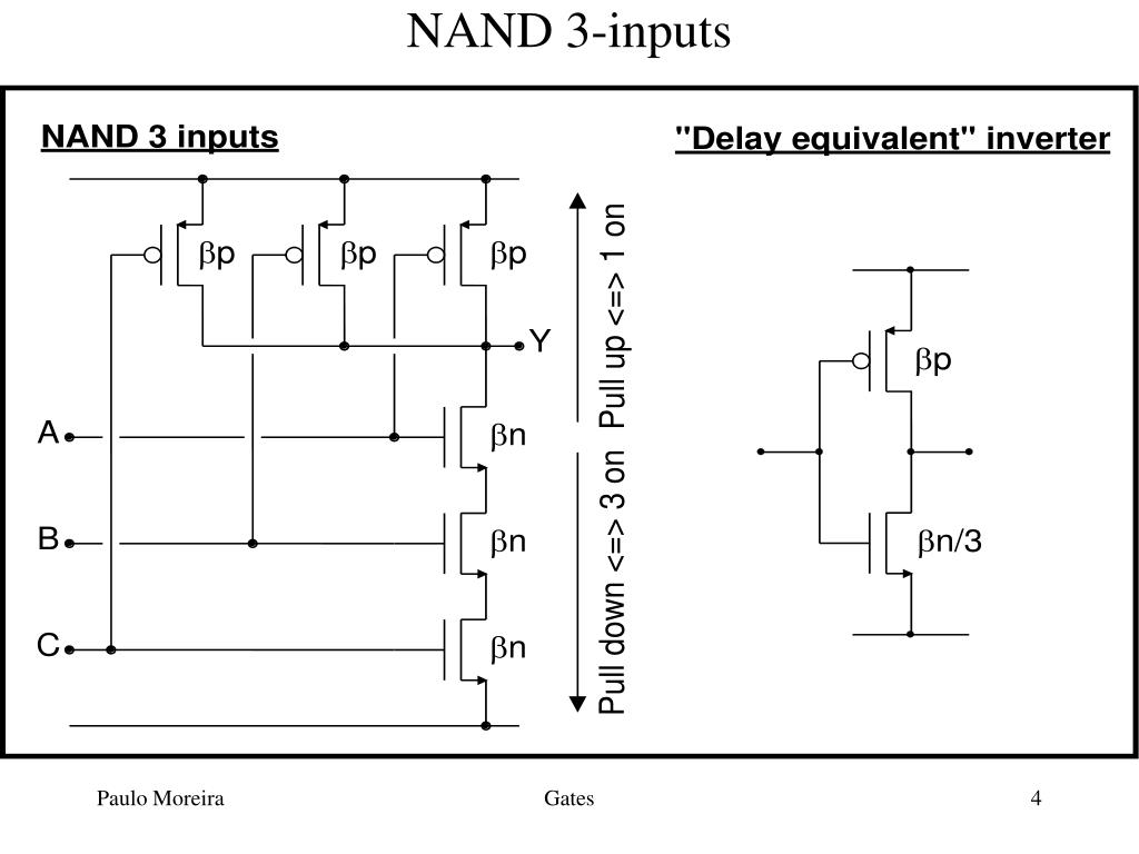 Lesson 4: “Just like LEGO”. The NAND gate “Reading” CMOS gates Designing CMOS gates. Logic. NAND 2-inputs. “Gates are inverters in disguise!”. NAND 3-inputs. NAND 3-inputs. NAND: Switching Time, Propagation Delay. t Low2High = R p /N (N*C out , p +C out , n /N+C load )