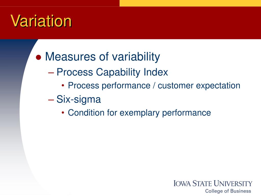 Variation • Measures of variability • Process Capability Index • Process performance / customer expectation • Six-sigma • Condition for exemplary performance